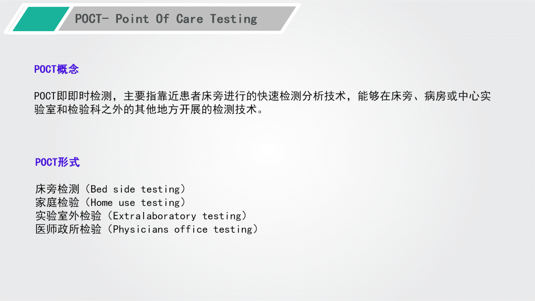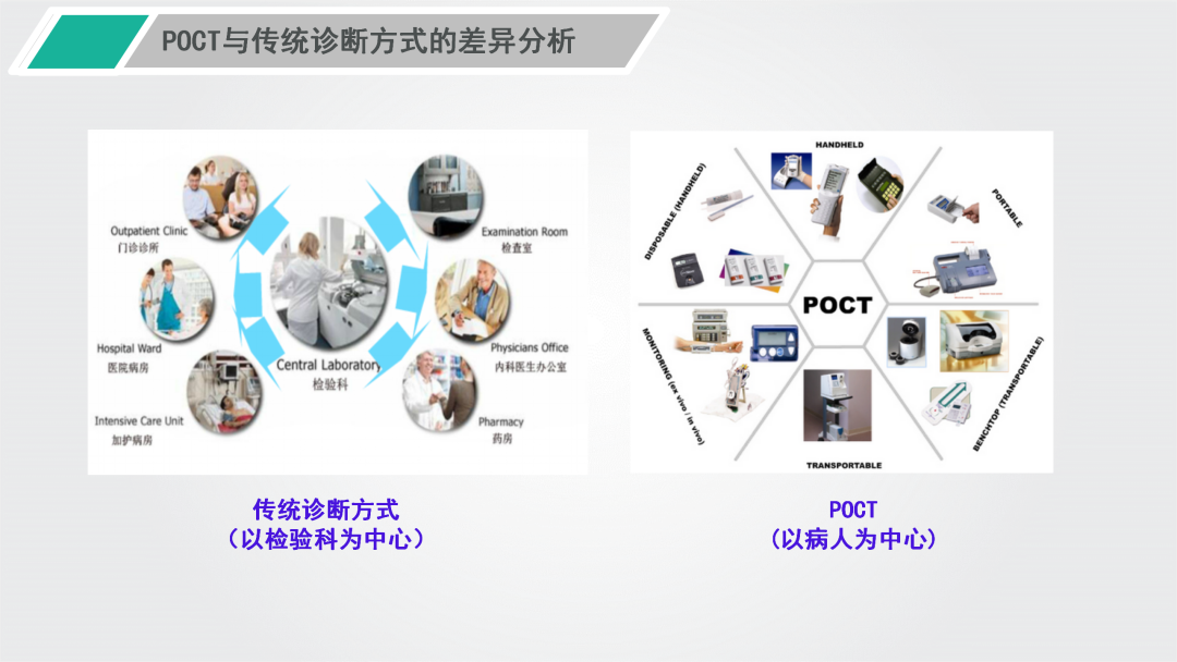 POCT是Point-of-CareTesting,中文一般譯成“床邊檢測”。NACB(美國國家臨床生化科學院)對POCT的定義是——在接近病人治療處,由未接受臨床實驗室學科訓練的專業臨床人員(professional)或者病人(self)進行的臨床檢驗,是在傳統、核心或中心實驗室以外進行的一切檢驗;理論上,POCT只是一種檢測平臺,目前所有的IVD項目都可以實現POCT檢測。