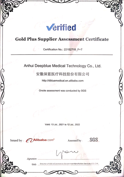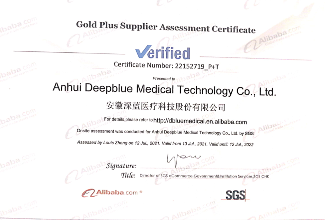 經(jīng)過SGS全程嚴(yán)格地審核與評估,深藍(lán)醫(yī)療各方面體系符合阿里巴巴金品誠企標(biāo)準(zhǔn)的要求,成功通過認(rèn)證,并于日前收到認(rèn)證證書。
