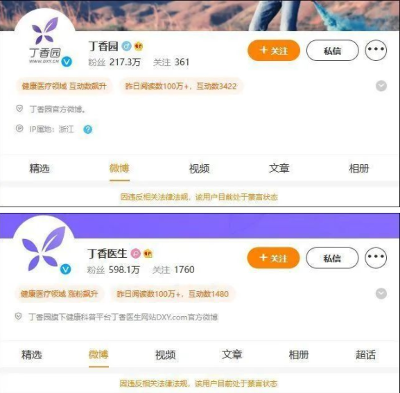 據(jù)了解,目前丁香園、丁香醫(yī)生、丁香媽媽、丁香生活研究所四個(gè)官方微博顯示,因違反相關(guān)法律法規(guī),四個(gè)用戶處于禁言狀態(tài)。