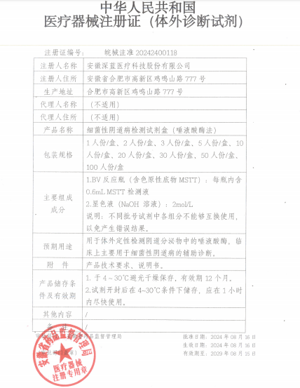近日,深藍醫(yī)療研發(fā)的細菌性陰道病檢測試劑盒(唾液酸酶法)通過國家藥品監(jiān)督管理局審核,獲批上市。此前,該試劑盒的冷藏儲存版已經獲得了注冊證,本次獲批的是更便于運輸、銷售和使用的常溫儲存版。這也是深藍醫(yī)療繼單項/三聯(lián)/四聯(lián)細菌性陰道病檢測試劑盒(酶化學反應法)、陰道炎快速檢測試劑盒(多胺法)后,又一獲批上市的婦科檢測整體解決方案代表性產品。