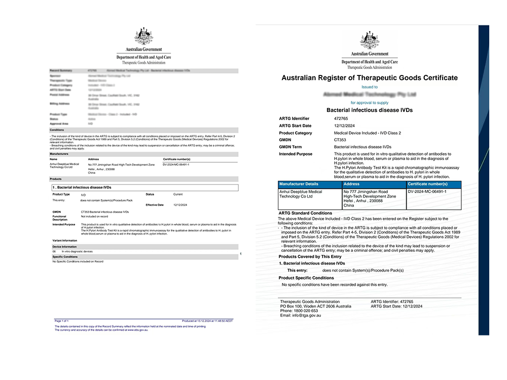 近日,深藍(lán)醫(yī)療傳來(lái)喜訊,公司自主研發(fā)的幽門螺旋桿菌抗體檢測(cè)試劑盒成功獲得澳大利亞醫(yī)療產(chǎn)品管理局(TGA)認(rèn)證(編號(hào):DV-2024-MC-06491-1),這一里程碑式的成就標(biāo)志著深藍(lán)醫(yī)療實(shí)現(xiàn)了零的突破,開(kāi)啟了進(jìn)軍國(guó)際市場(chǎng)的新篇章,在市場(chǎng)拓展上邁出了重要的一步,也為全球幽門螺旋桿菌檢測(cè)領(lǐng)域注入了新的活力。