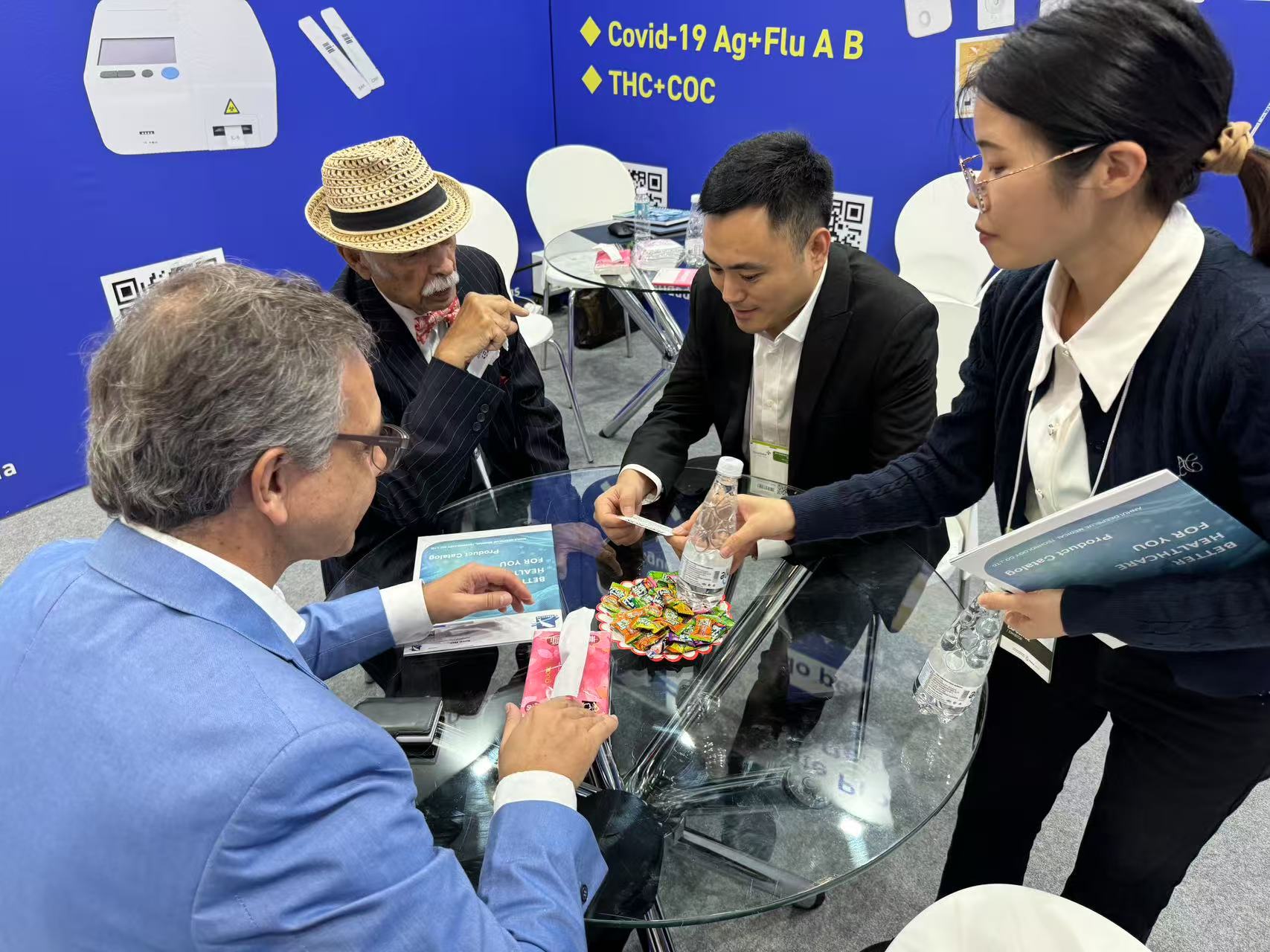 安徽深藍(lán)醫(yī)療科技股份有限公司(以下簡稱“深藍(lán)醫(yī)療”)作為國家高新技術(shù)企業(yè),專注于體外診斷試劑、醫(yī)療器械及醫(yī)療健康產(chǎn)品的研發(fā)、生產(chǎn)與銷售。此次已是深藍(lán)醫(yī)療第三次亮相該展,去年參展的豐碩成果堅(jiān)定了公司繼續(xù)深耕拉美市場(chǎng)的決心。在本次展會(huì)上,深藍(lán)醫(yī)療攜十余年研發(fā)沉淀的系列產(chǎn)品驚艷登場(chǎng),涵蓋傳染病檢測(cè)、寵物檢測(cè)、毒品檢測(cè)、孕產(chǎn)婦科檢測(cè)、女性生育檢測(cè)及其他系列,吸引了眾多采購商駐足。為增強(qiáng)產(chǎn)品吸引力,深藍(lán)醫(yī)療特別在展位設(shè)置產(chǎn)品體驗(yàn)區(qū),讓客戶親身參與疾病檢測(cè)體驗(yàn),直觀感受產(chǎn)品優(yōu)勢(shì)。