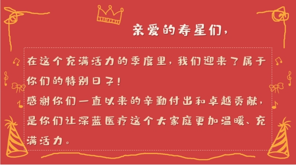 深藍醫(yī)療始終秉持“以人為本” 的發(fā)展理念,致力于打造一個充滿尊重、關(guān)愛與歸屬感的工作環(huán)境,將員工關(guān)懷融入到日常工作的點滴之中,關(guān)注每一位員工的成長與幸福。從節(jié)日福利到生日驚喜,從職業(yè)發(fā)展規(guī)劃到身心健康關(guān)懷,每一次貼心的關(guān)懷,每一次真誠的祝福,都在不斷凝聚著深藍人的心,讓大家感受到家一般的溫暖和支持。